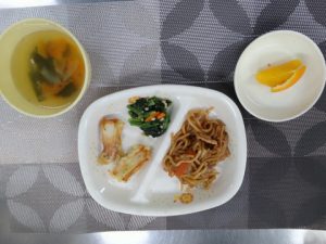 焼きそば、ちくわの磯辺揚げ、ほうれん草の納豆和え