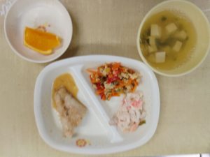 魚の味噌煮、れんこんサラダ、人参しりしり、すまし汁、オレンジ🍊