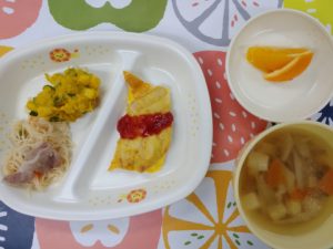 魚のピカタ、南瓜サラダ、焼きビーフン、鶏ごぼう汁、オレンジ🍊