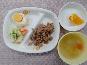 豚のしょうが焼き、キャベツのごまマヨ和え、煮卵、スープ、オレンジ🍊