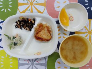 鯖の竜田揚げ、切り干し大根の煮物、白菜とちくわの和え物、すまし汁、オレンジ🍊