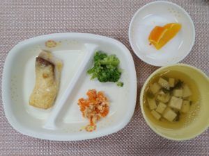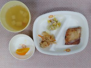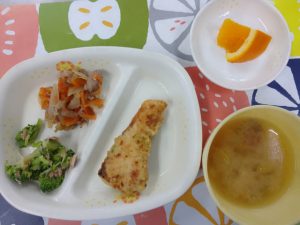 魚のコーンマヨ焼き、人参しりしり、ブロッコリーのおかか和え、オレンジ🍊
